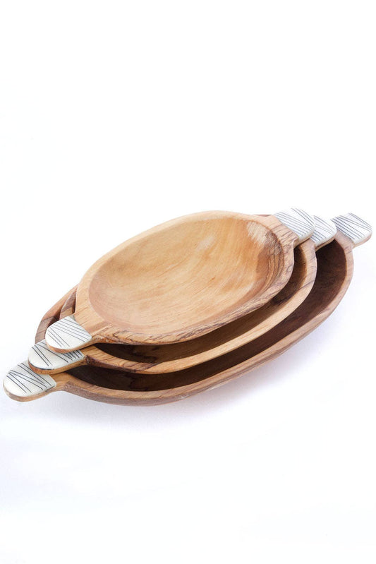 Set of Three Oval Wild Olive Wood Bowls with Striped Bone Handles