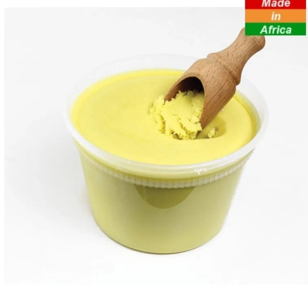 Pure Unrefined Shea Butter is handcrafted in Ghana, West Africa from the nut of the African Shea Tree. It contains a rich amount of fatty acid that is crucial to renewing and replenishing intense moisture instantly and overtime from your head to toe. RA Cosmetics Pure Shea Butter provides all the essential vitamins needed to make your hair and skin look and feel smoother, softer and most importantly, healthier. Its therapeutic properties protect from the wind, cold, and sun. It helps heal and diminish the appearance of wounds, scars, and stretch marks. Our RA Yellow Shea Butter is essentially how shea butter is produced in its raw state, with no refining taking place or adding of preserving chemicals or oils. RA Cosmetics 100% Pure Unrefined Shea Butter (Tub) comes in 8, 16 and 32oz sizes. RA Shea Butter will naturally reveal the softer, more beautiful side of your skin! Benefits -Treatment of dry skin, eczema, and minor burns. -Pain relief from swelling and arthritis.