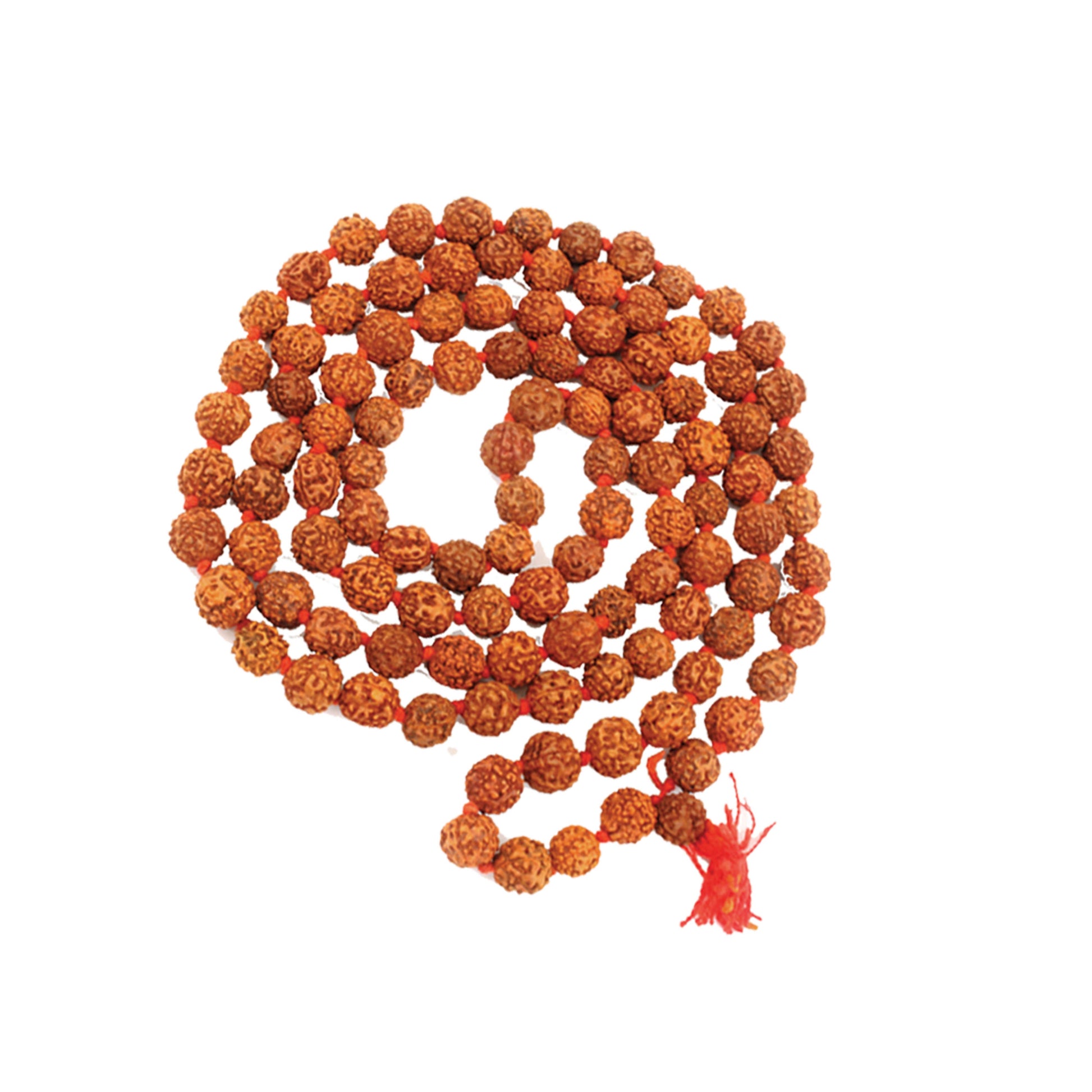 The five faced (mukhi) Rudraksha beads in this mala represents Lord Shiva the symbol of auspiciousness and brings inner peace, knowledge, power and enlightenment. Rudraksha beads have electromagnetic properties that affect all the 7 chakras when it is worn. It is considered a good omen for good health, helps bring positive changes. It is knotted by artisans in India - 108+1 beads with tassel.