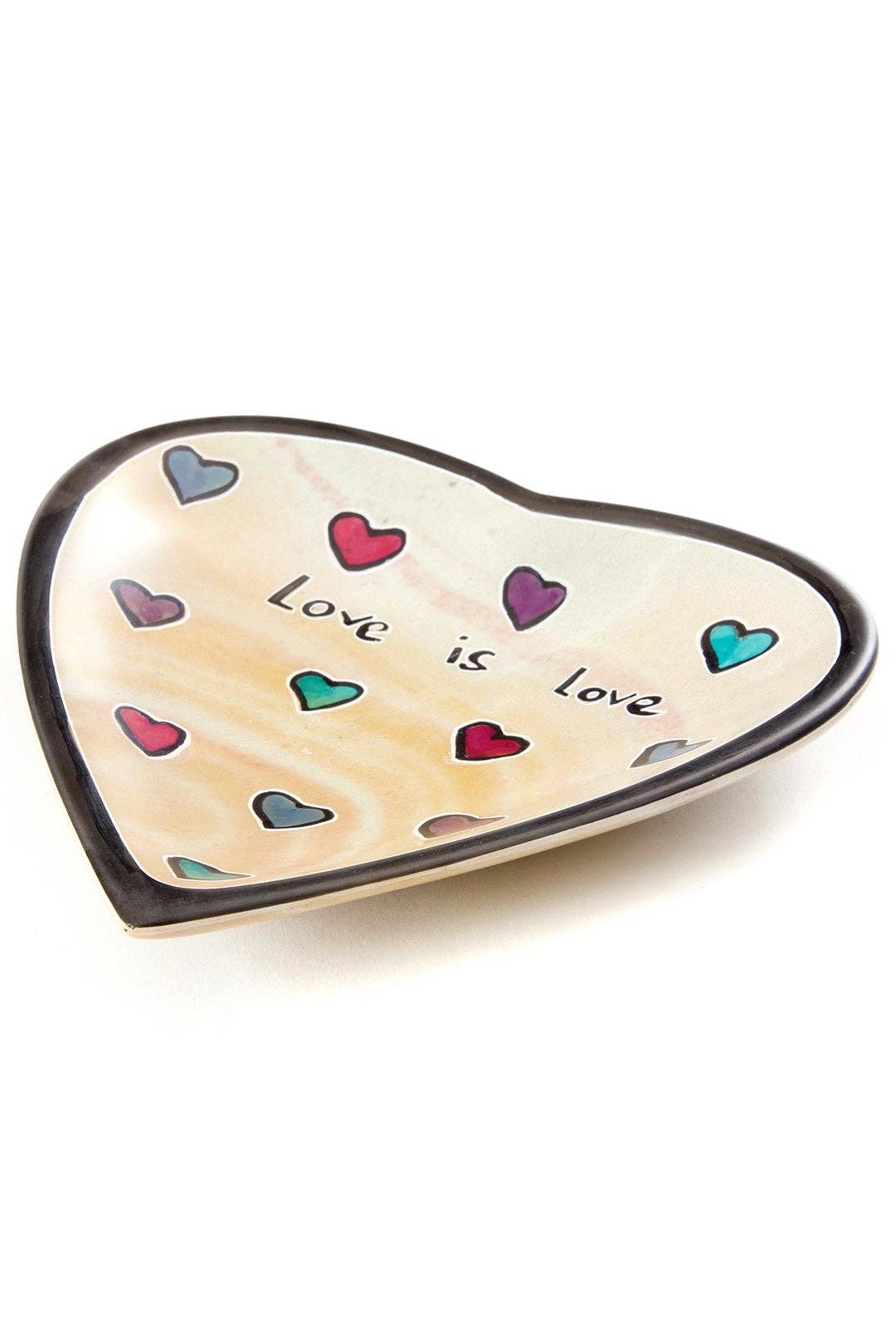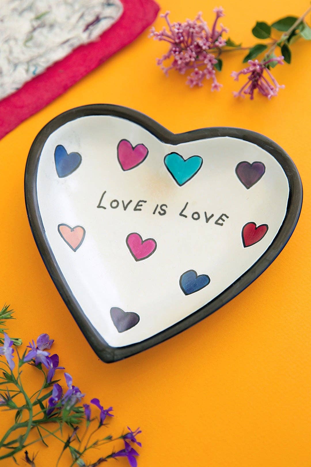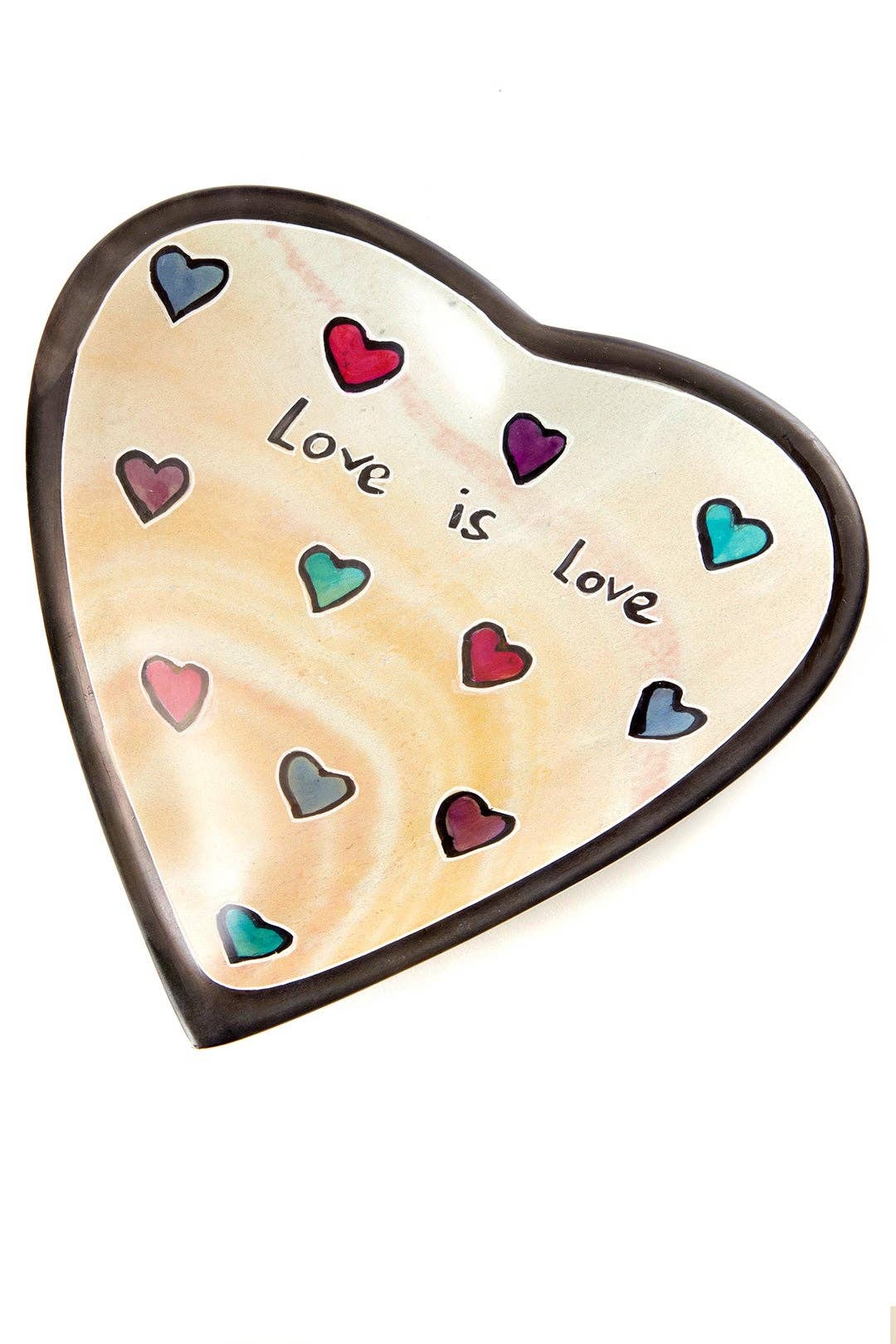 Kenyan artisans craft beautiful decorative heart dishes from soft soapstone, then add a simple message: "love is love". Hand-dyed hearts and a bold black rim complete the dish. This unique piece makes a thoughtful gift for young and old.