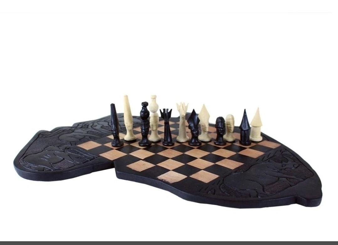 Makonde Chess Board Makonde Chess Set [3] Africa Board Up your game with this Makonde Chess Set Africa Board. The distinctive chess board is shaped like the continent of Africa and has a black base that is carved with African animals. The squares are natural wood and ebony colored. The beautifully carved chess pieces are ebony and ivory colored. A-M160 Outside is approximately 12" wide and 14" tall game board is approximately 7.5" x7.5" Packing Weight : 3.12 lb(s) Made in Kenya