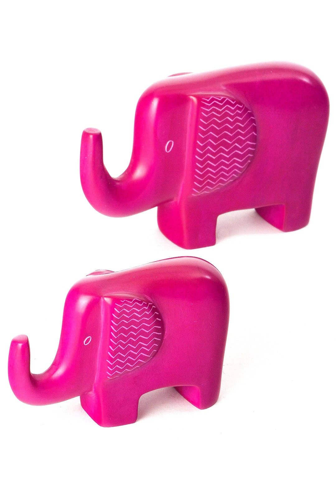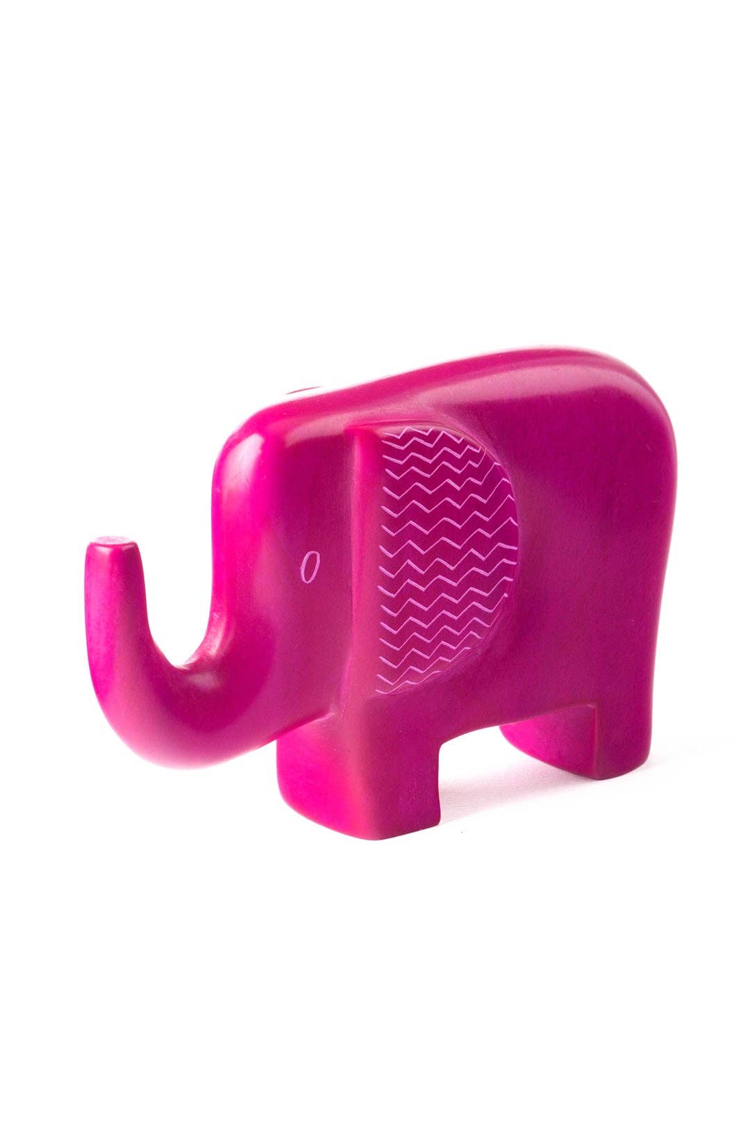 Kenyan artisans hand carve sweet elephant sculptures from soft soapstone, then hand dye each piece with rich dark pink dye. Incised zigzag designs on the ears add personality.