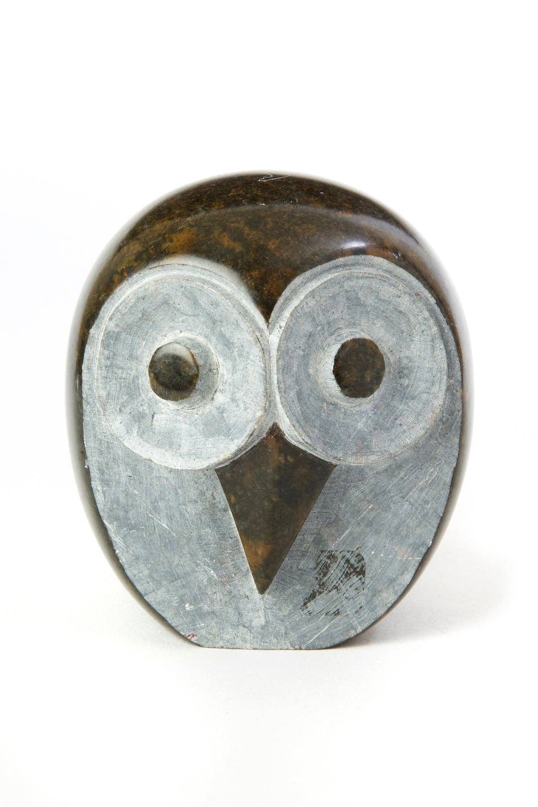 Zimbabwean artisan Luke Jimu and his team sculpt serpentine stone into a sweet owl sculpture characterized by contrast between rough and polished stone. Because no stone is the same, every owl is unique.