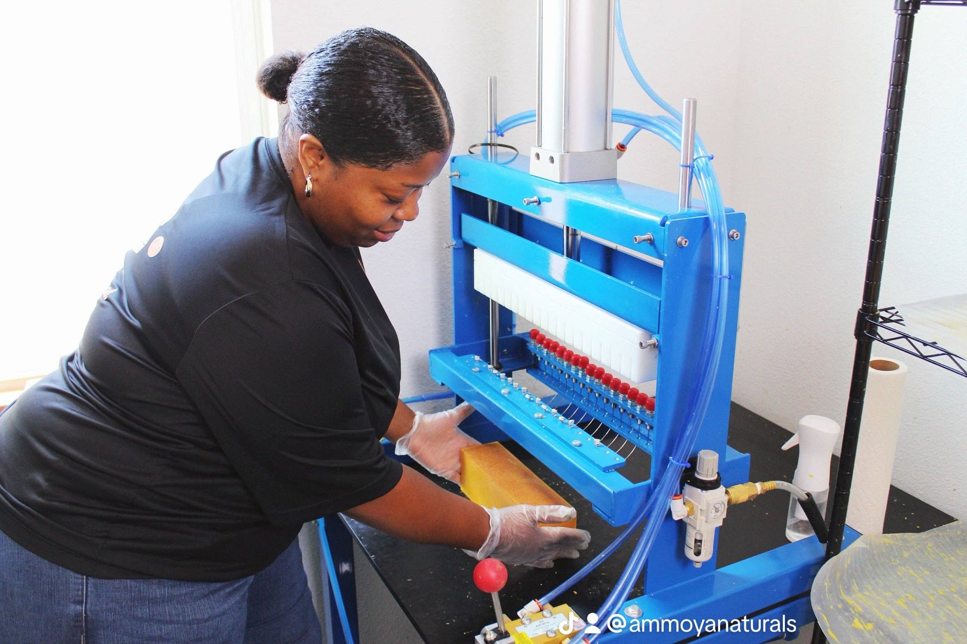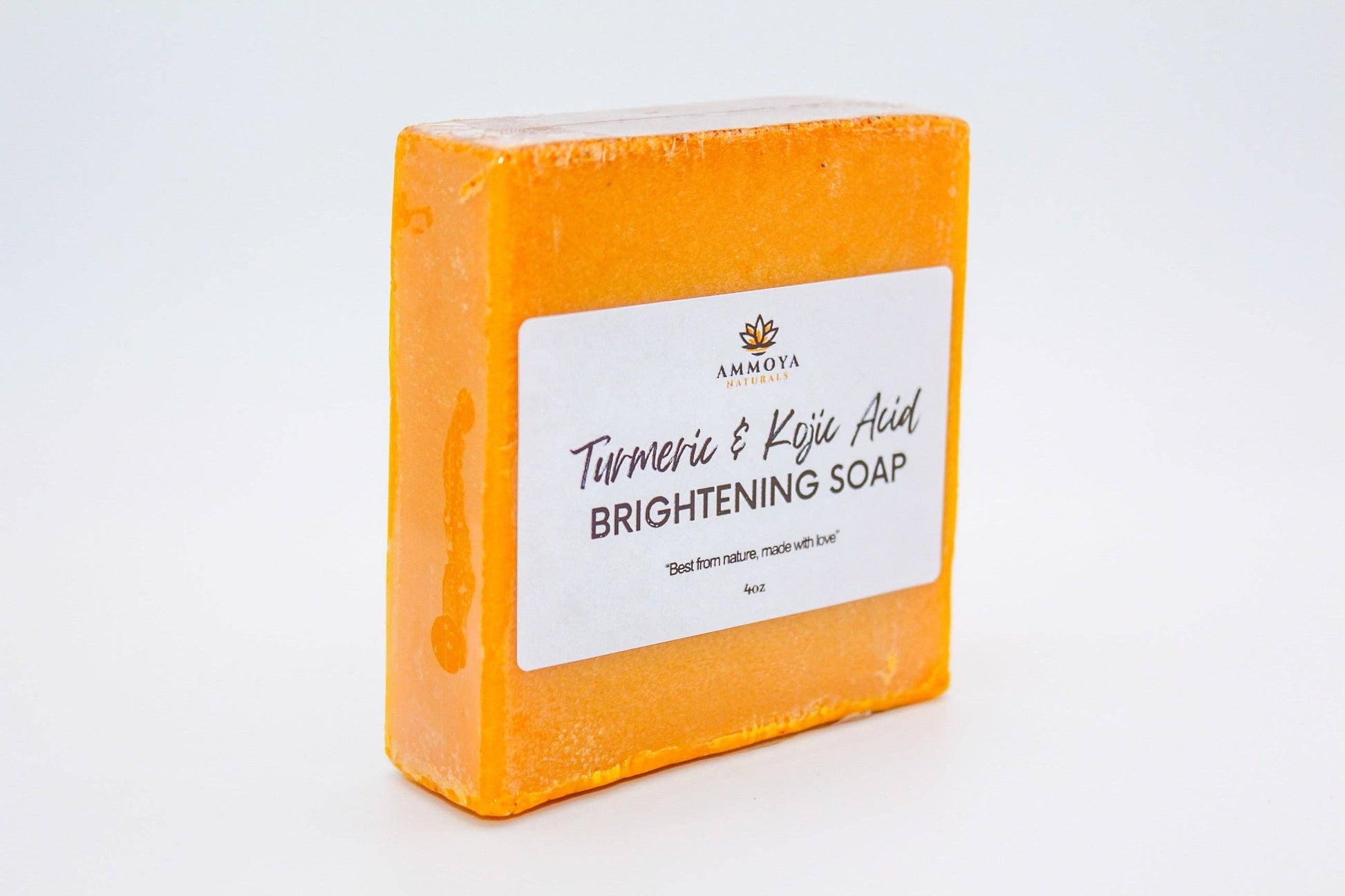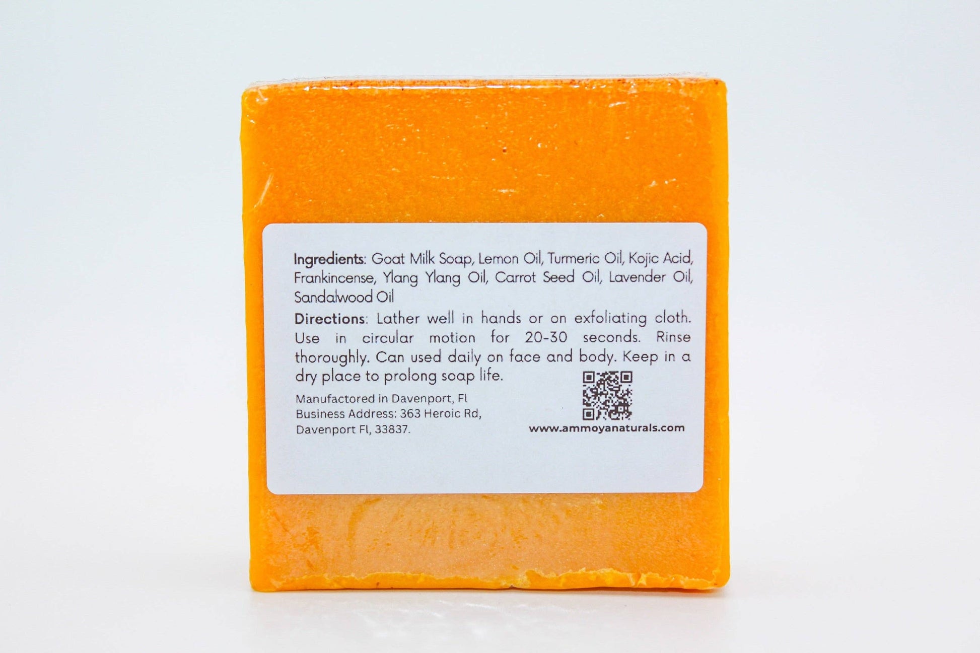 This turmeric and kojic acid bar soap is crafted with turmeric essential oil, turmeric powder, goat milk soap, kojic acid, lemon essential oil, frankincense essential oil, ylang ylang essential oil, clary sage essential oil, myrrh essential oil, and sandalwood essential oil.
